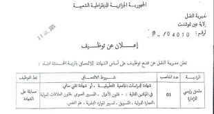 الجمهورية الجزائرية الديمقراطية الشعبية مديرية النقل ولاية عين تموشنت إعلان عن توظيف ads تعلن مديرية النقل عن فتح توظيف على أساس الشهادة للالتحاق بالرتبة المحددة أدناه: مديرية التربية تفتح مسابقة توظيف العمال المهنيين 180 منصب سوناطراك توظف في التخصصات الطبية والادارية وأعوان الأمن مديرية …
