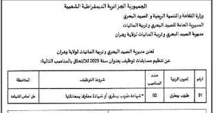 وزارة الفلاحة والتنمية الريفية والصيد البحري المديرية العامة للصيد البحري وتربية المائيات مديرية الصيد البحري وتربية المائيات لولاية وهران ads اعلان عن توظيف تعلن مديرية الصيد البحري وتربية المائيات لولاية وهران عن تنظيم مسابقات توظيف بعنوان سنة 2025 للالتحاق بالمناصب التالية: الرقمتعيين الرتبةعدد المناصبشروط …