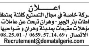 إعلان ads شركة خاصة في مجال التصنيع كائنة بمنطقة النشاطات بئر الجير – وهران تبحث عن عاملات بدون مؤهلات مقيمات بمدينة وهران وضواحيها. قنوات الاتصال : 0659.57.14.69 / 0560.08.25.01 [email protected] إعلان عن توظيف بالمجلس الأعلى للشباب: الجزائر العاصمة، البليدة، تيبازة، بومرداس. إعلان توظيف في …
