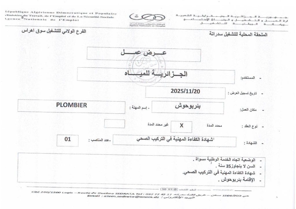 المنصب: PLOMBIER