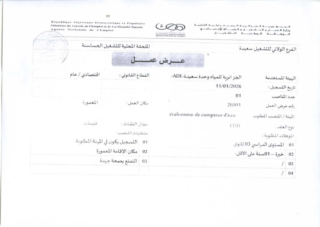 المهنة / المنصب المطلوب: étalonneur de compteur d’eau (معاير عدادات المياه)