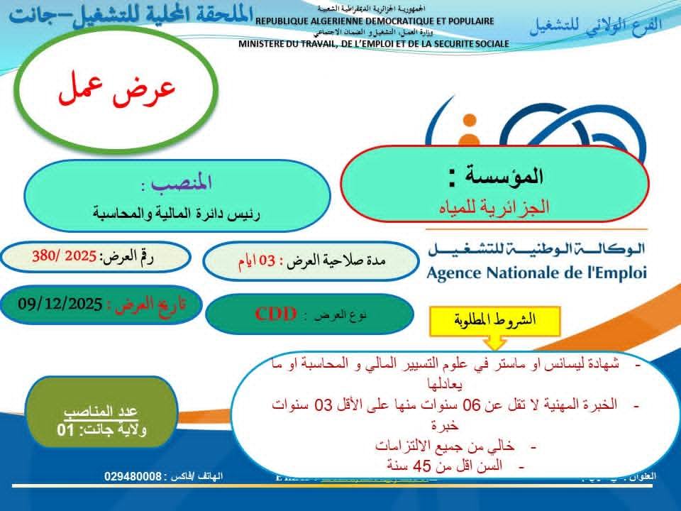 رئيس دائرة المالية والمحاسبة عدد المناصب ولاية جانت: 01