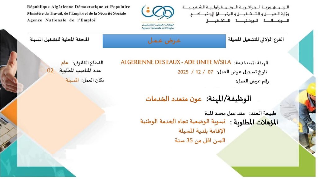 الهيئة المستخدمة: ALGERIENNE DES EAUX – ADE UNITE M’SILA
