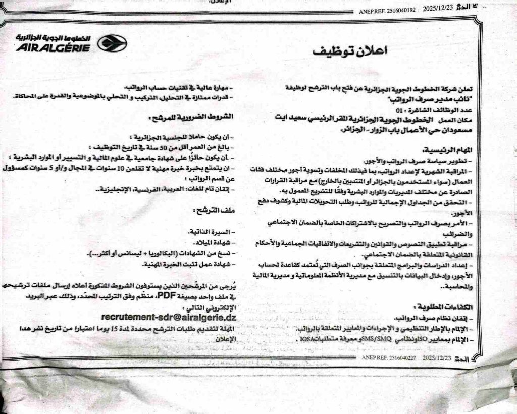 تعلن شركة الخطوط الجوية الجزائرية عن فتح باب الترشح لوظيفة “نائب مدير صرف الرواتب”.