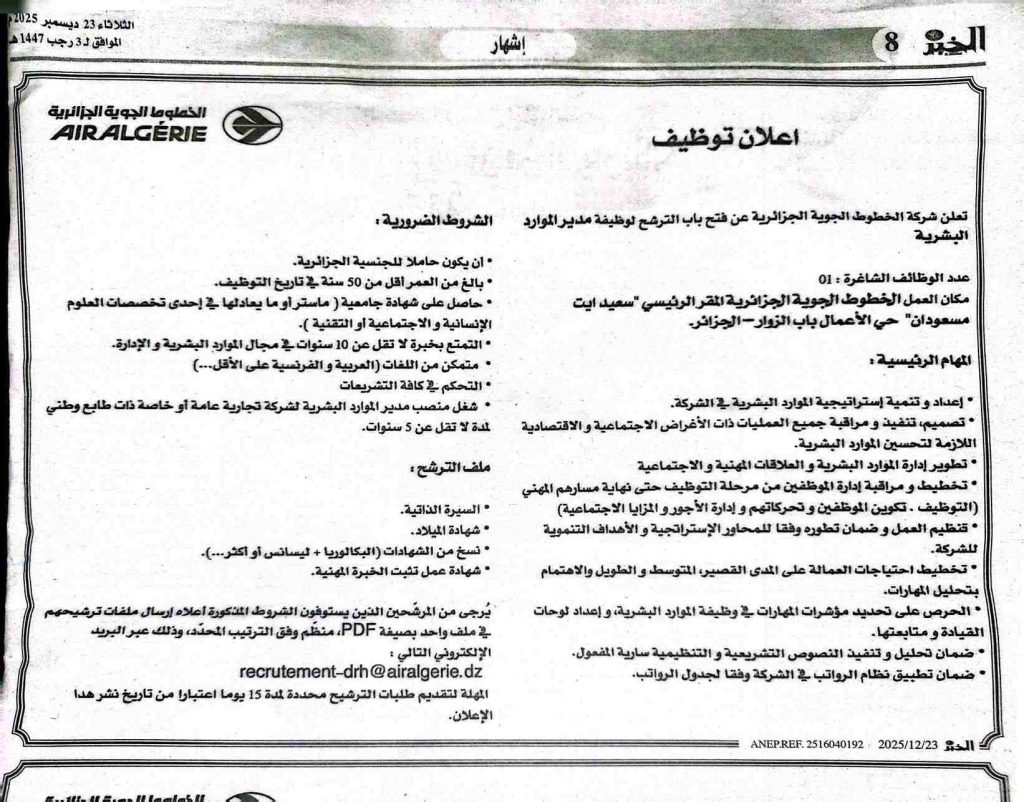 تعلن شركة الخطوط الجوية الجزائرية عن فتح باب الترشح لوظيفة “مدير الموارد البشرية”.