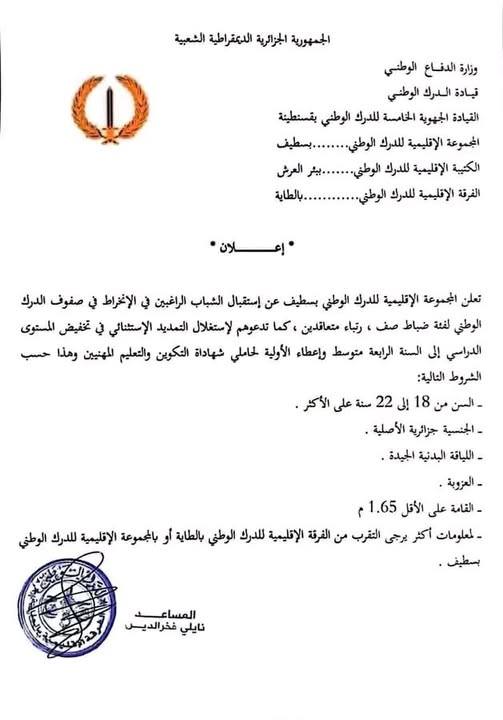 تعلن المجموعة الإقليمية للدرك الوطني بسطيف عن إستقبال الشباب الراغبين في الإنخراط في صفوف الدرك الوطني لفئة ضباط صف ، رتباء متعاقدين ، كما تدعوهم لإستغلال التمديد الإستثنائي في تخفيض المستوى الدراسي إلى السنة الرابعة متوسط وإعطاء الأولوية لحاملي شهاداة التكوين والتعليم المهنيين وهذا حسب الشروط التالية: