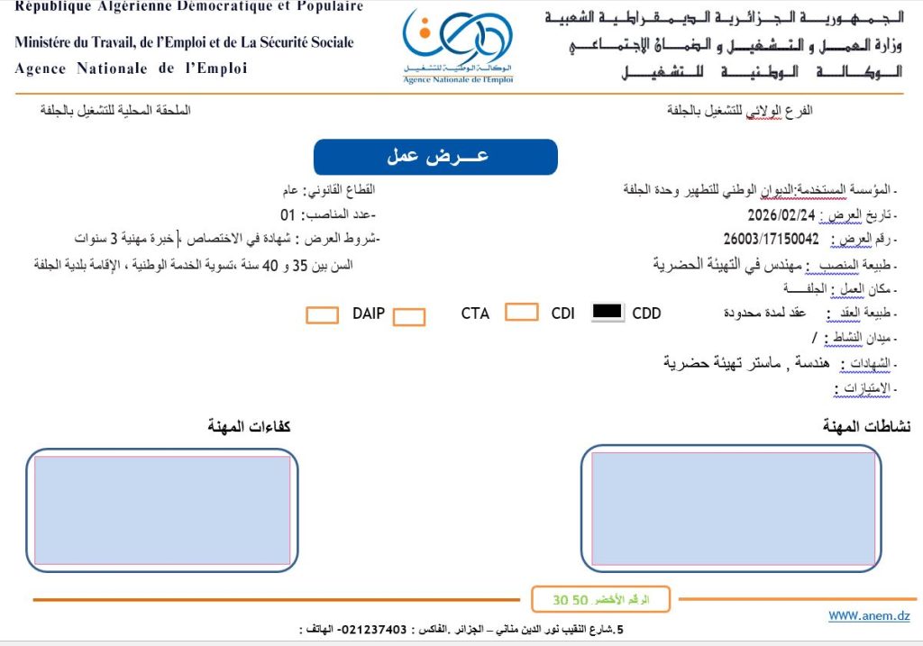 • شروط العرض: شهادة في الاختصاص، خبرة مهنية 3 سنوات، السن بين 35 و 40 سنة، تسوية الخدمة الوطنية، الإقامة ببلدية الجلفة.