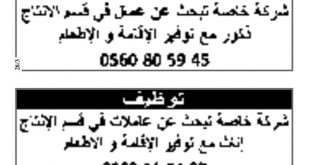 السلام عليكم متابعي مدونة التوظيف في الجزائر نقدم لكم مجموعة من عروض التوظيف في القطاع الخاص نقلا عن الجرائد الجزائرية لنهار اليوم تابع الاعلانات في الصور المرفقة اسفله