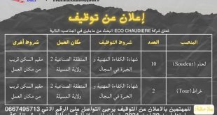 اعلان عن توظيف شركة إيكو شوديير SARL ECO CHAUDIERE ads العنوان: المنطقة الصناعية BP 596 M’sila 28000 الجزائر شركة إيكو شوديير تعلن عن توظيف: المسمى الوظيفيالعددالشروطمكان العملشروط أخرىلحام (Soudeur)10شهادة الكفاءة المهنية والخبرة في المجالالمنطقة الصناعية 2 ولاية المسيلةمقيم السكن قريب من مكان العملخراط (Tour)2شهادة …