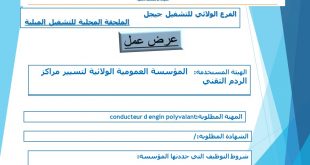 الجمهورية الجزائرية الديمقراطية الشعبية وزارة العمل والتشغيل والضمان الاجتماعي الوكالة الوطنية للتشغيل الفرع الولائي للتشغيل جيجل الملحقة المحلية للتشغيل الميلية ads عرض عمل الهيئة المستخدمة: المؤسسة العمومية الولائية لتسيير مراكز الردم التقني المهنة المطلوبة: conducteur d’engin polyvalent (سائق آلة متعددة الاستعمالات) الشهادة المطلوبة: / …