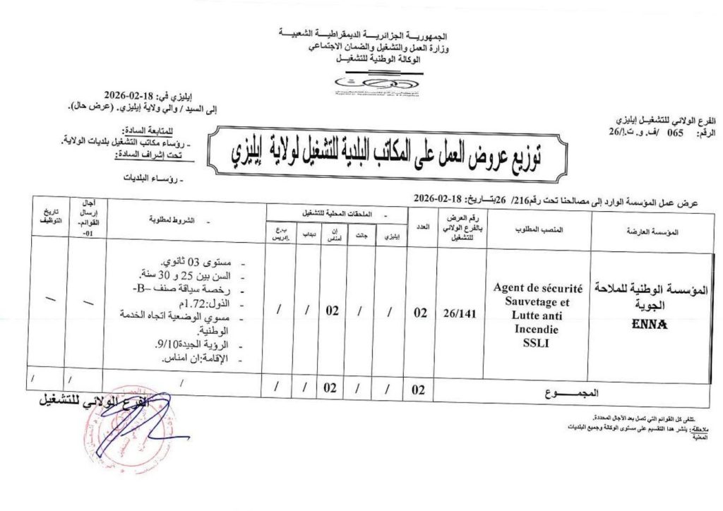 | المؤسسة الوطنية للملاحة الجوية ENNA | Agent de sécurité Sauvetage et Lutte anti Incendie SSLI | 02 | إيليزي: / جانت: / إن أمناس: 02 دبداب: / ب.ع.إدريس: / | – مستوى 3 ثانوي. – السن بين 25 و 30 سنة. – رخصة سياقة صنف -B-. – الطول: 1.72م. – مسوي الوضعية اتجاه الخدمة الوطنية. – الرؤية الجيدة 10/9. – الإقامة: إن أمناس. |