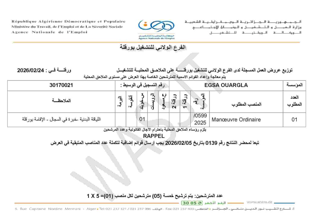 | EGSA OUARGLA | 01 | Mancœuvre Ordinaire | اللياقة البدنية – خبرة في المجال – الإقامة بورقلة |