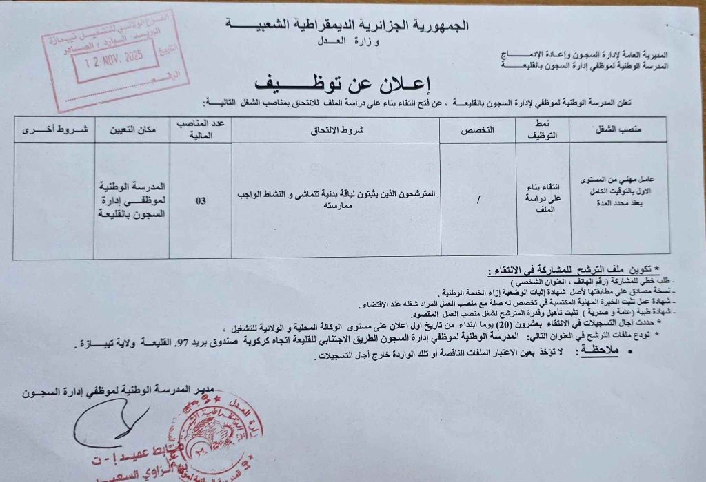 عامل مهني من المستوى الأول بالتوقيت الكامل بعقد محدد المدةانتقاء بناء على دراسة الملف/ [علامة مائلة]المترشحون الذين يثبتون لياقة بدنية تتماشى و النشاط الواجب ممارسته03المدرسة الوطنية لموظفي إدارة السجون بالقليعة/