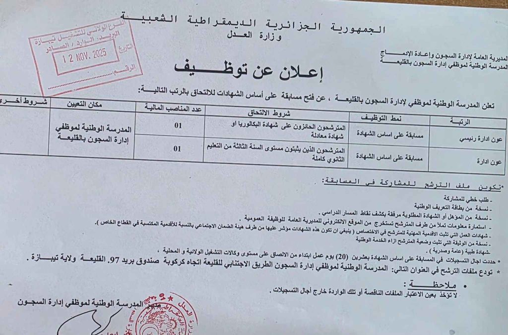 * تودع ملفات الترشح في العنوان التالي: المدرسة الوطنية لموظفي إدارة السجون الطريق الإجتنابي للقليعة إتجاه كروكوبة صندوق بريد 97. القليعة ولاية تيبازة.