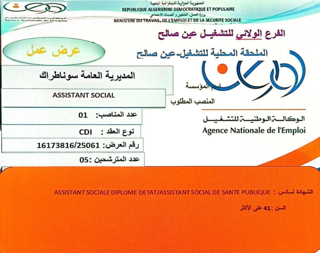 ASSISTANT SOCIAL | 01 | ASSISTANT SOCIAL DIPLOME D’ETAT / ASSISTANT SOCIAL DE SANTE PUBLIQUE | 41 على الأكثر | |