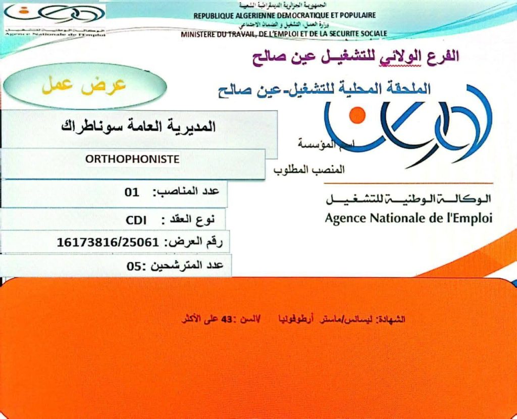 ORTHOPHONISTE | 01 | ليسانس/ماستر أرطفونيا | 43 على الأكثر | |
