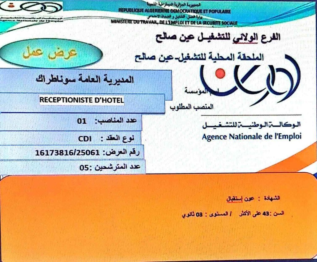 RECEPTIONISTE D’HOTEL | 01 | عون إستقبال | 43 على الأكثر | المستوى: 03 ثانوي |