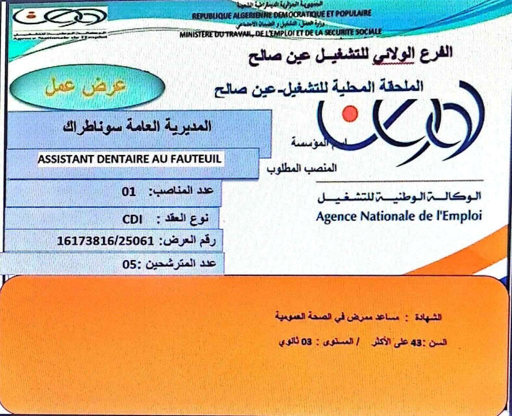 ASSISTANT DENTAIRE AU FAUTEUIL | 01 | مساعد ممرض في الصحة العمومية | 43 على الأكثر | المستوى: 03 ثانوي |