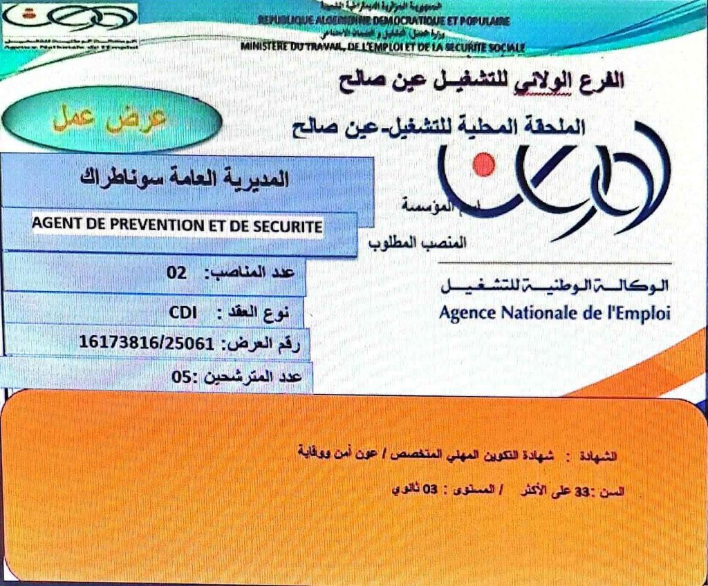 AGENT DE PREVENTION ET DE SECURITE | 02 | شهادة التكوين المهني المتخصص / عون أمن ووقاية | 33 على الأكثر | المستوى: 03 ثانوي |