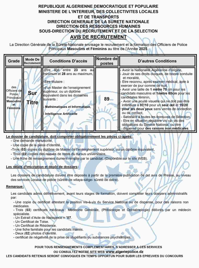 | ضباط الشرطة رئيسيين ذكور وإناث | على أساس الشهادة | – أن يتراوح سنهم ما بين 23 سنة على الأقل و 28 سنة على الأكثر. – أن يكونوا متحصلين على شهادة ماستر التعليم العالي أو شهادة معادلة لها، في ميادين التالية: – الرياضيات والإعلام الآلي، – ذكاء الاصطناعي | 89 | – الحيازة على الجنسية الجزائرية الأصلية. – التمتع بالحقوق المدنية، السيرة والأخلاق الحسنة. – أن يكونوا قادرين بعد فحص طبي على العمل ليلاً ونهاراً. – أن لا تقل قامتهم عن 1 متر و 70 سنتيمتر بالنسبة للذكور، 1 متر و 65 سنتيمتر بالنسبة للإناث. – أن تعادل حدة بصرهم 20/15 بدون استعمال النظارات أو عدسات التصحيح، على ألا تكون حدة رؤية العين الواحدة أقل من 10/07. – أن ينجحوا في جميع اختبارات الانتقاء. – أن يكونوا في وضعية قانونية اتجاه واجب الخدمة الوطنية أو معفى لأسباب غير طبية. |