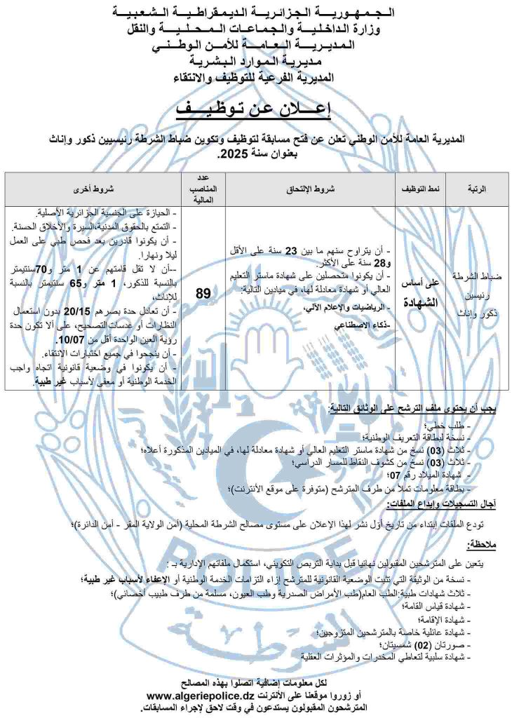 تعلن المديرية العامة للأمن الوطني عن فتح مسابقة لتوظيف وتكوين ضباط الشرطة رئيسيين ذكور وإناث بعنوان سنة 2025.