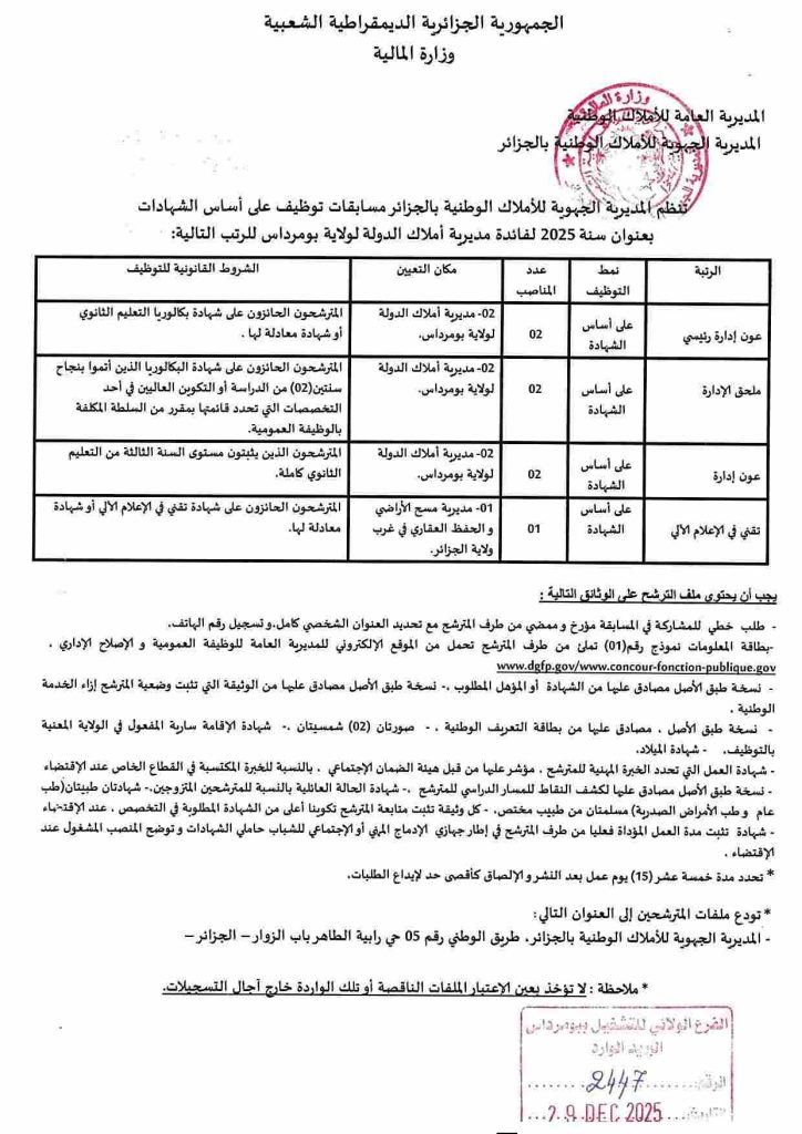 بعنوان سنة 2025 لفائدة مديرية أملاك الدولة لولاية بومرداس للرتب التالية: