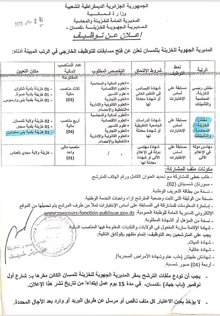 تعلن المديرية الجهوية للخزينة بتلمسان عن فتح مسابقات للتوظيف الخارجي في الرتب المبينة أدناه: