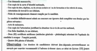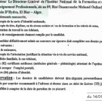 - ملاحظات:1 / يلغى نجاح المترشحين الذين يثبت في حقهم تقديم معلومات خاطئة عند ملء بطاقة المعلومات.2 / لا يؤخذ بعين الإعتبار (يرفض) الملفات الناقصة أو التي ترد قبل أو بعد الآجال المحددة أعلاه.3 / ترفض ملفات المترشحين الموظفين في نفس الرتبة.