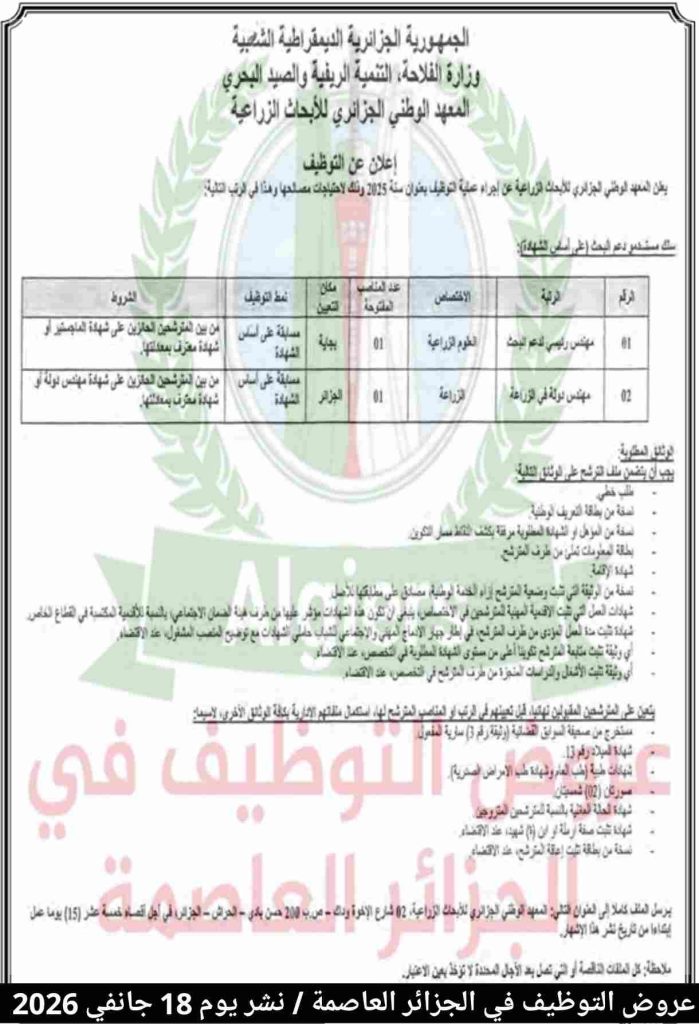 يعلن المعهد الوطني الجزائري للأبحاث الزراعية عن إجراء عملية التوظيف بعنوان سنة 2025 وذلك لاحتياجات مصالحها وهذا في الرتب التالية: