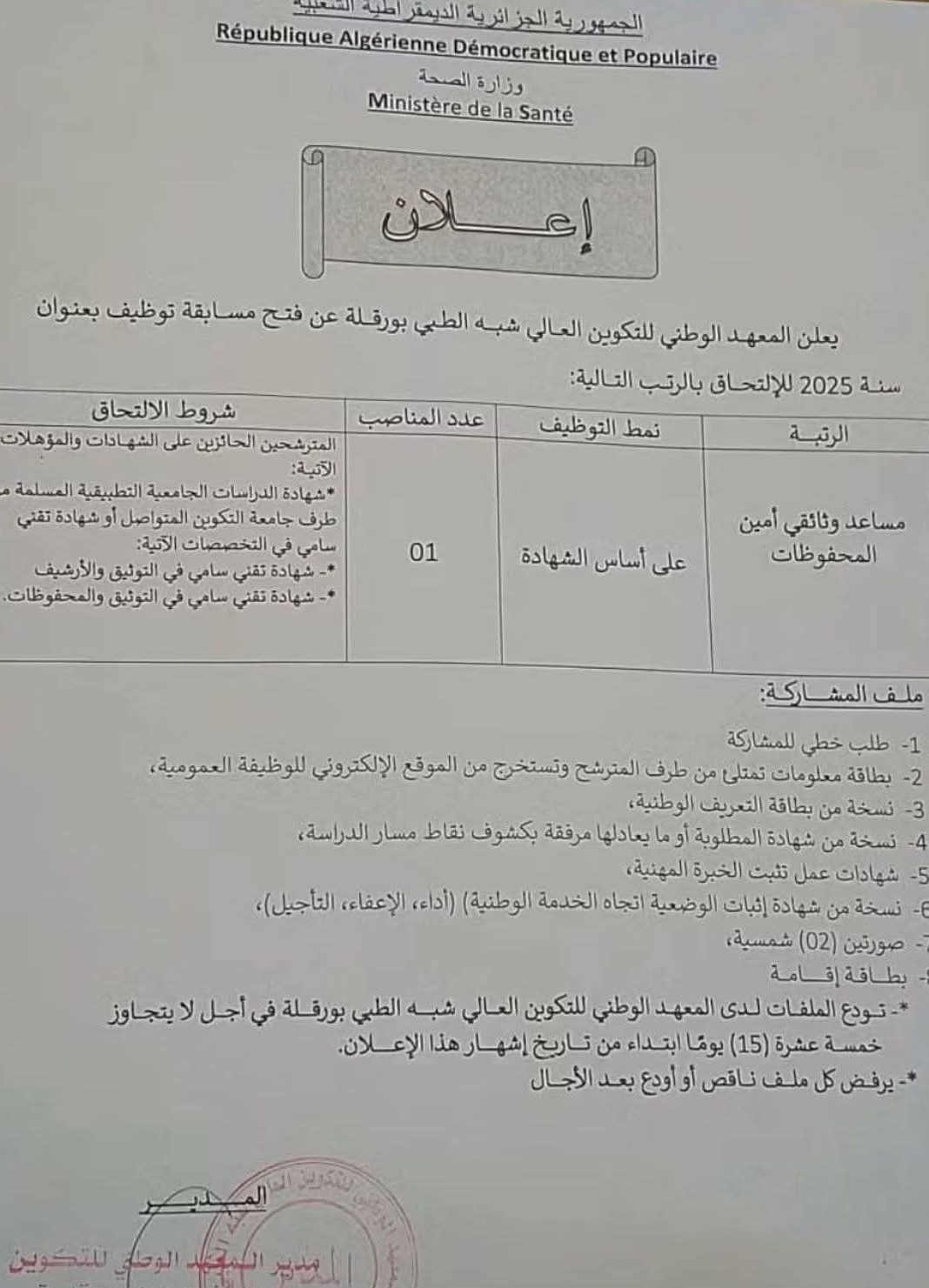 يعلن المعهد الوطني للتكوين العالي شبه الطبي بورقلة عن فتح مسابقة توظيف بعنوان سنة 2025 للإلتحاق بالرتب التالية: