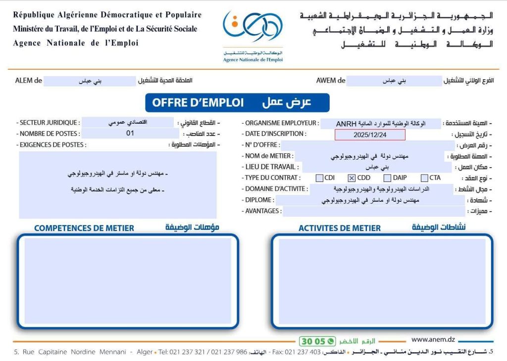 الهيئة المستخدمة: الوكالة الوطنية للموارد المائية ANRH