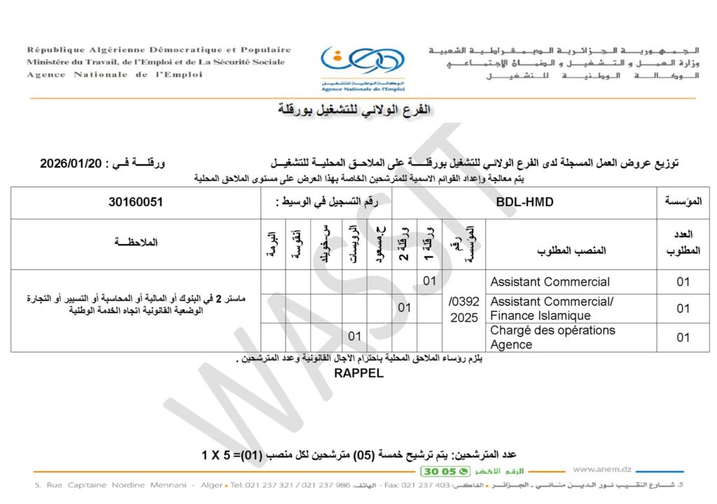 | 01 | Assistant Commercial / Finance Islamique | ورقلة 2: (01) | |