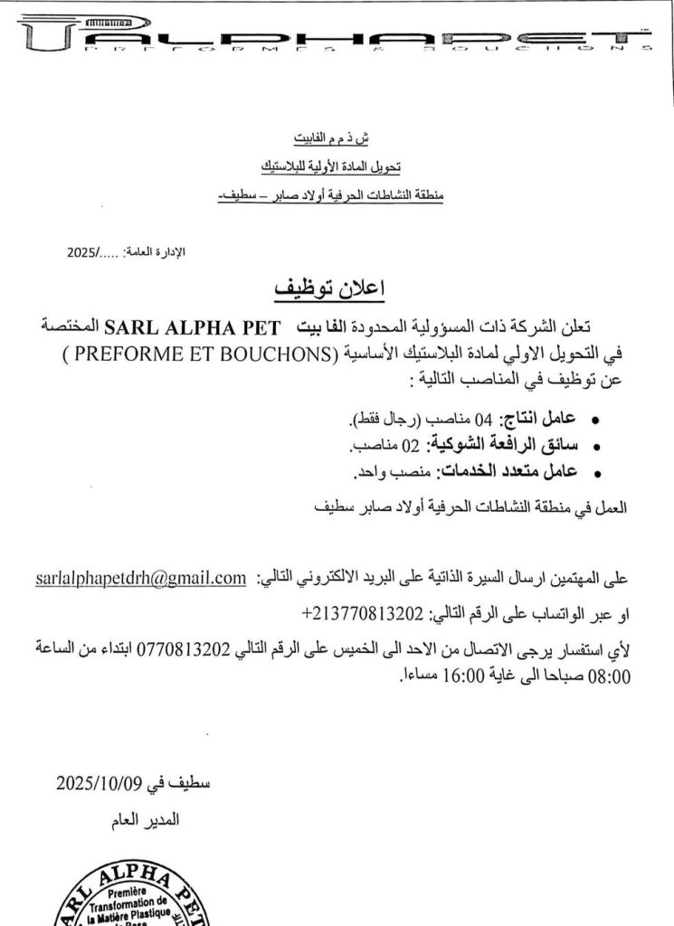 تعلن الشركة ذات المسؤولية المحدودة ألفا بيت SARL ALPHA PET المختصة في التحويل الأولي لمادة البلاستيك الأساسية (PREFORME ET BOUCHONS ) عن توظيف في المناصب التالية: