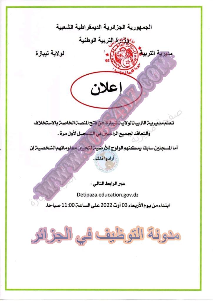 تعلم مديرية التربية لولاية تيبازة عن فتح المنصة الخاصة بالاستخلاف والتعاقد لجميع الراغبين في التسجيل لاول مرة اما المسجلين سابقا يمكنكم الولوج للارضية لتحيين معلوماتهم الشخصية ان ارادو ذلك عبر الرابط التالي