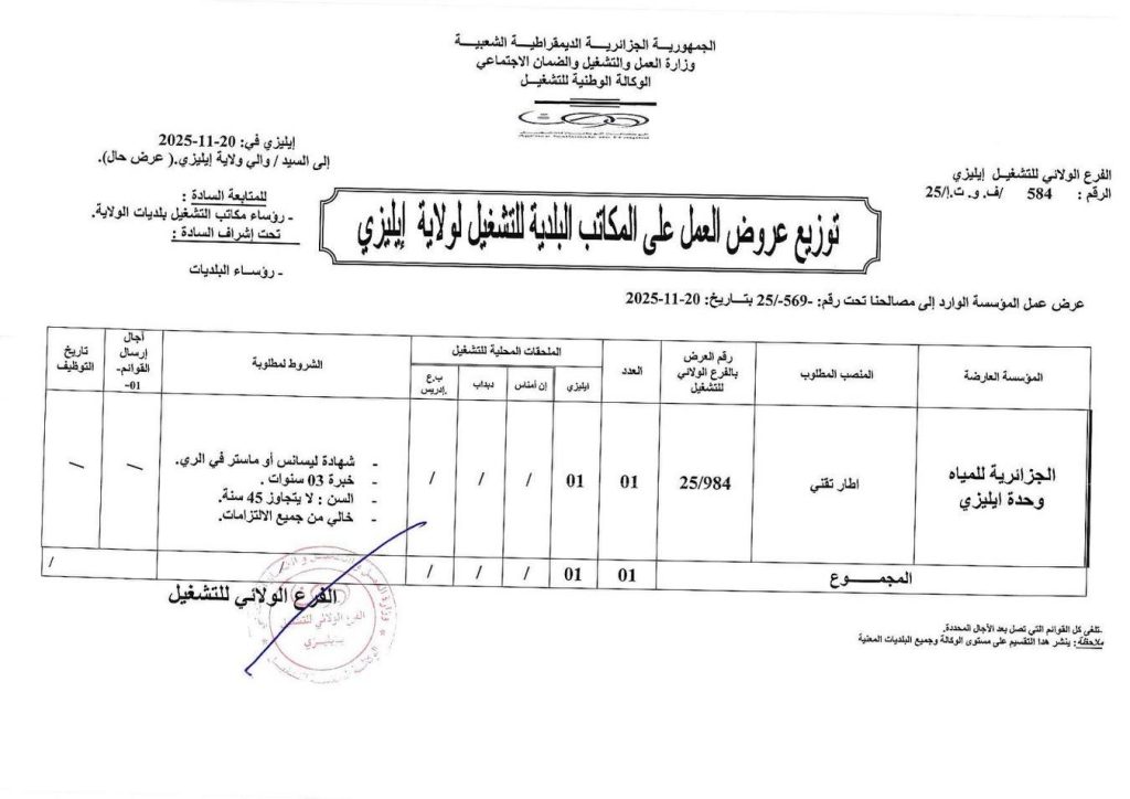 توزيع عروض العمل على المكاتب البلدية للتشغيل لولاية إليزي