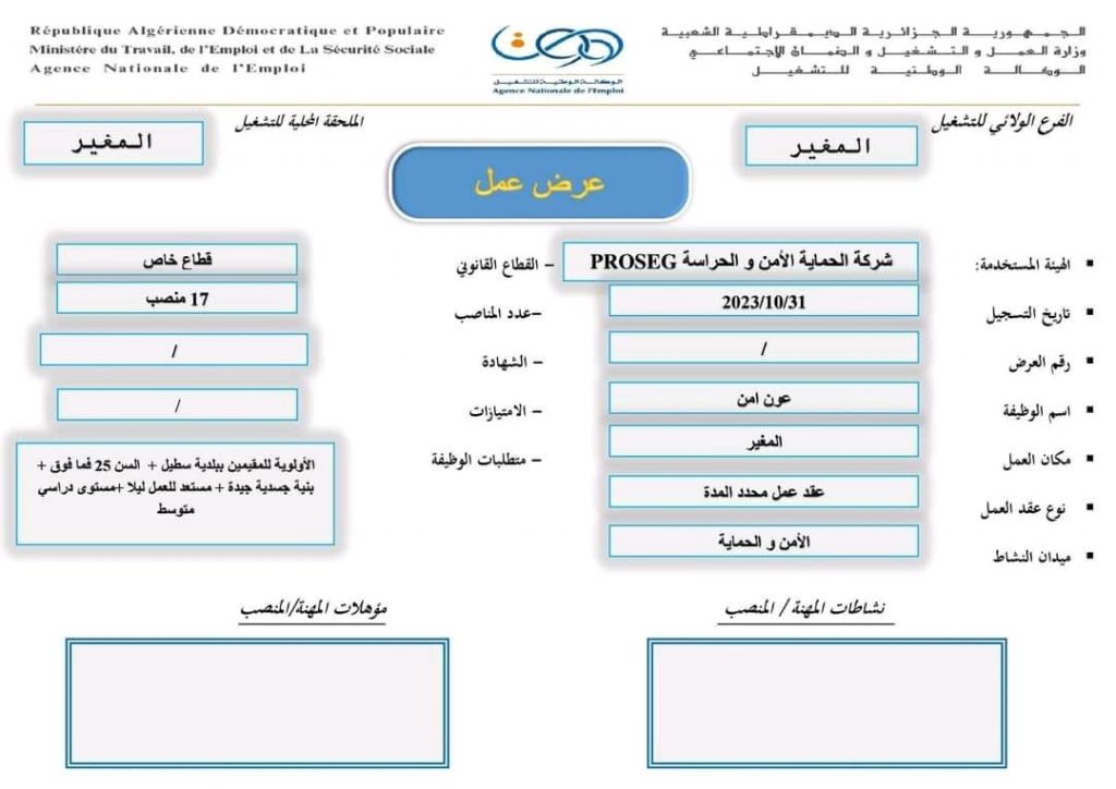 تعلن الملحقة المحلية للتشغيل المغير اعن عرض عمل بشركة الحماية الامن والحراسة PROSEG كما هو موضح ادناه