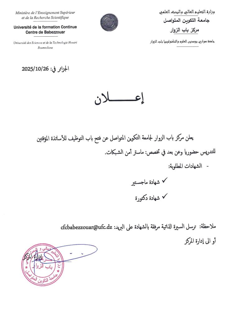 يعلن مركز باب الزوار لجامعة التكوين المتواصل عن فتح باب التوظيف للأساتذة المؤقتين للتدريس حضوريا وعن بعد في تخصص: ماستر أمن الشبكات.