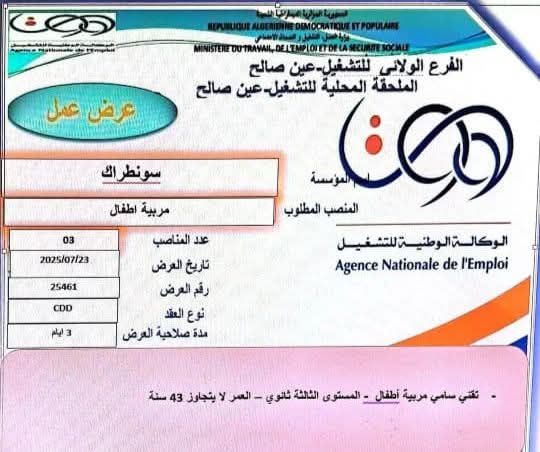 تم الاتصال بشركة سونطراك وتم التأكيد لنا أنه سيحدد تاريخ إجراء الفحوصات المهنية الخاصة بجميع عروض عمل ولاية إن صالح في الأيام القليلة القادمة.