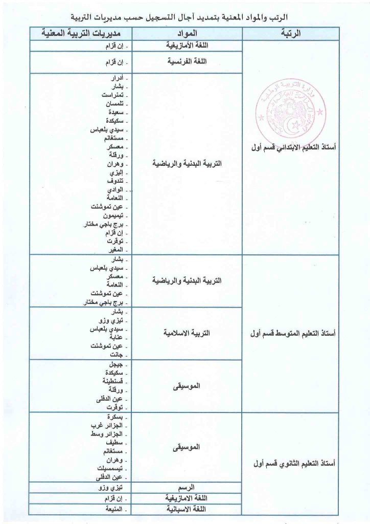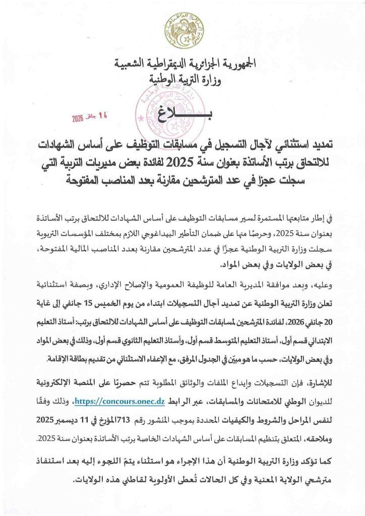 تمديد استثنائي لآجال التسجيل في مسابقات التوظيف على أساس الشهادات للالتحاق برتب الأساتذة بعنوان سنة 2025، لفائدة بعض مديريات التربية التي سجلت عجزًا في عدد المترشحين مقارنة بعدد المناصب المفتوحة.