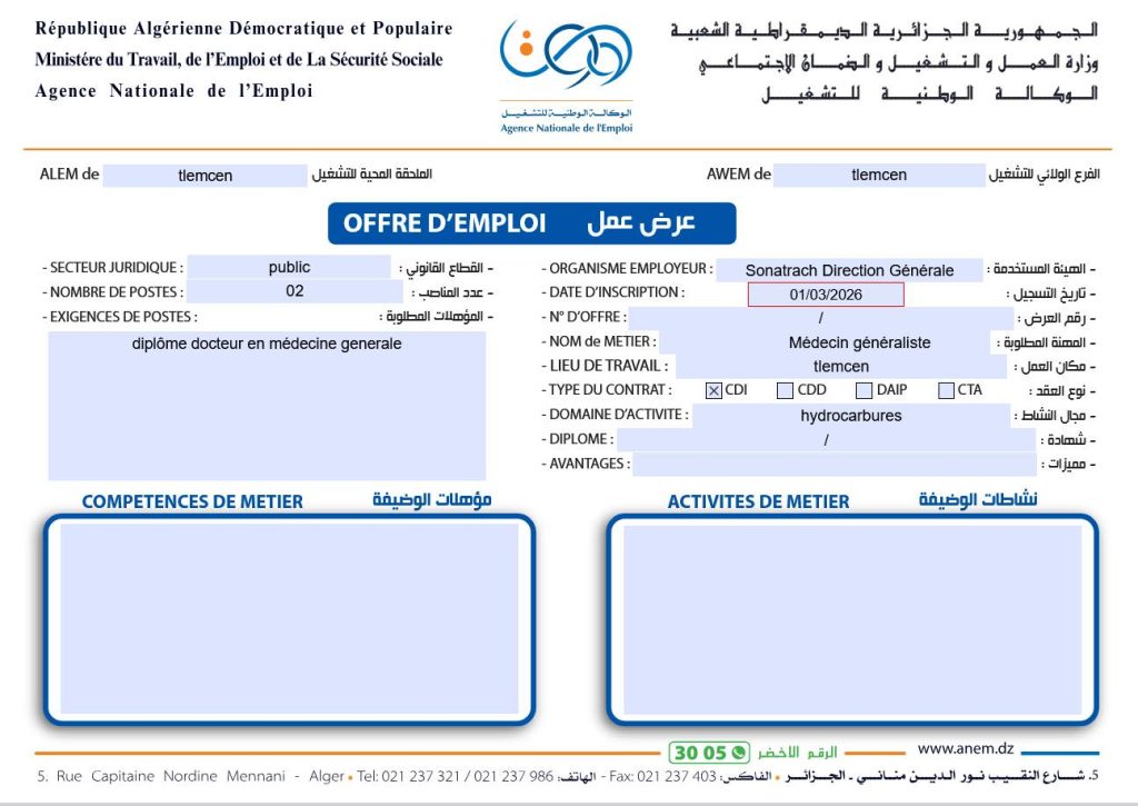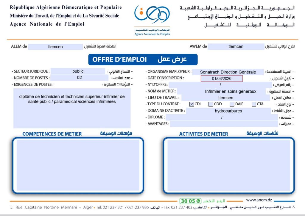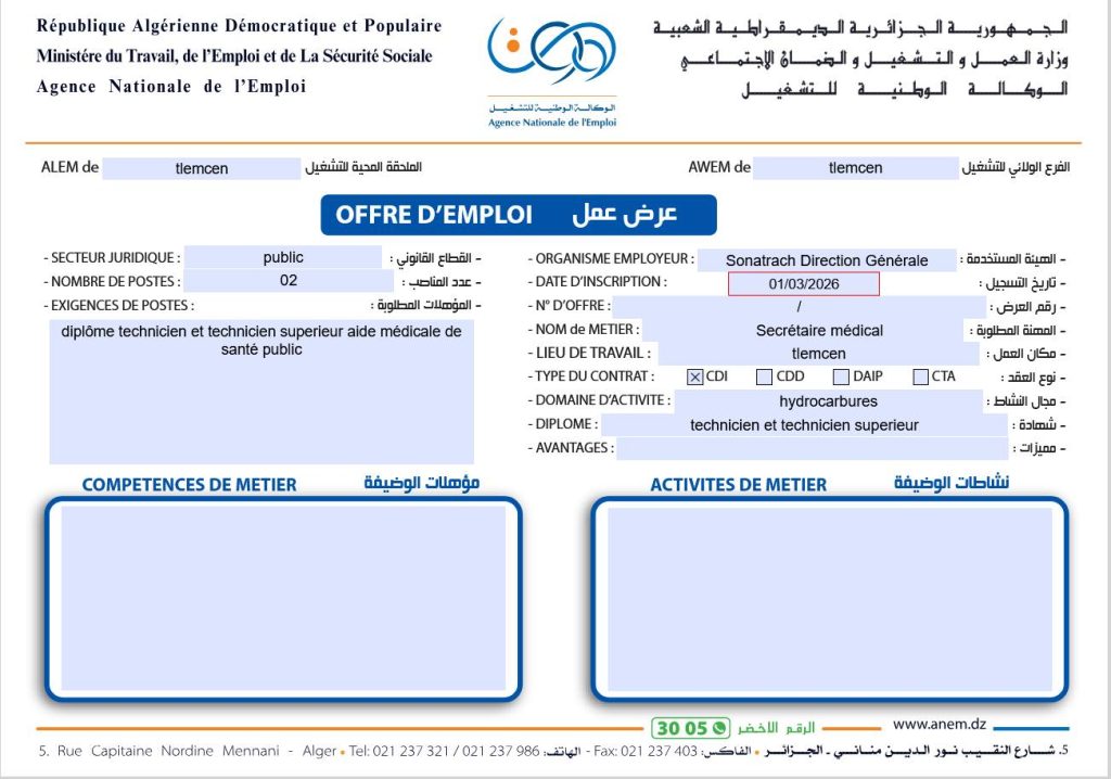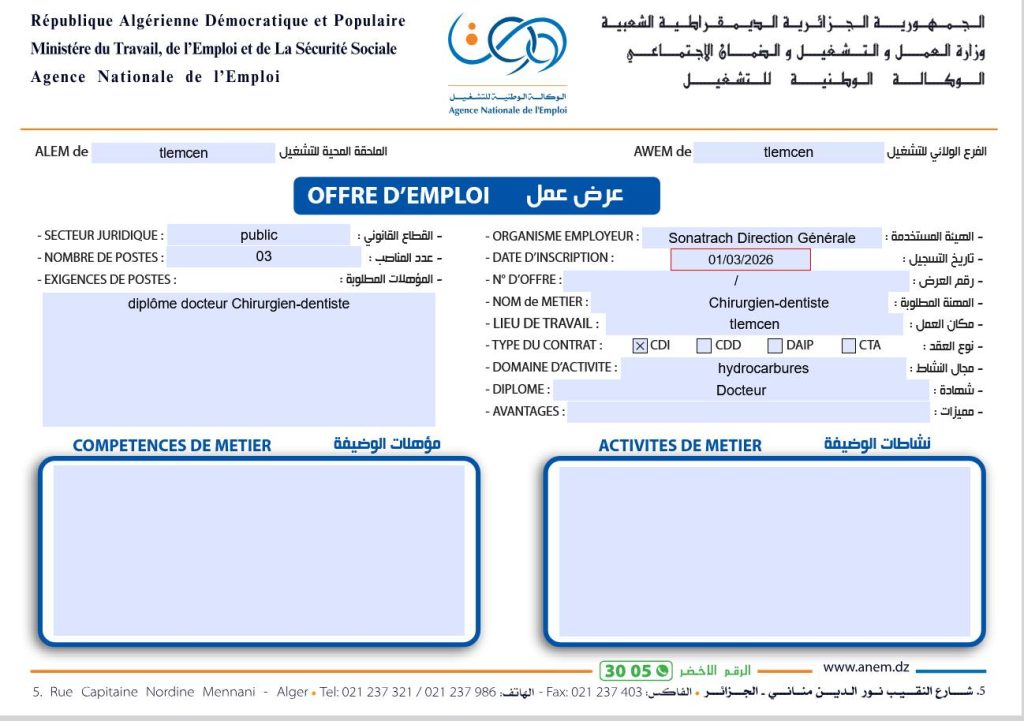 المنصب المطلوب (Nom de métier)عدد المناصبالمؤهلات المطلوبة / الشهادة