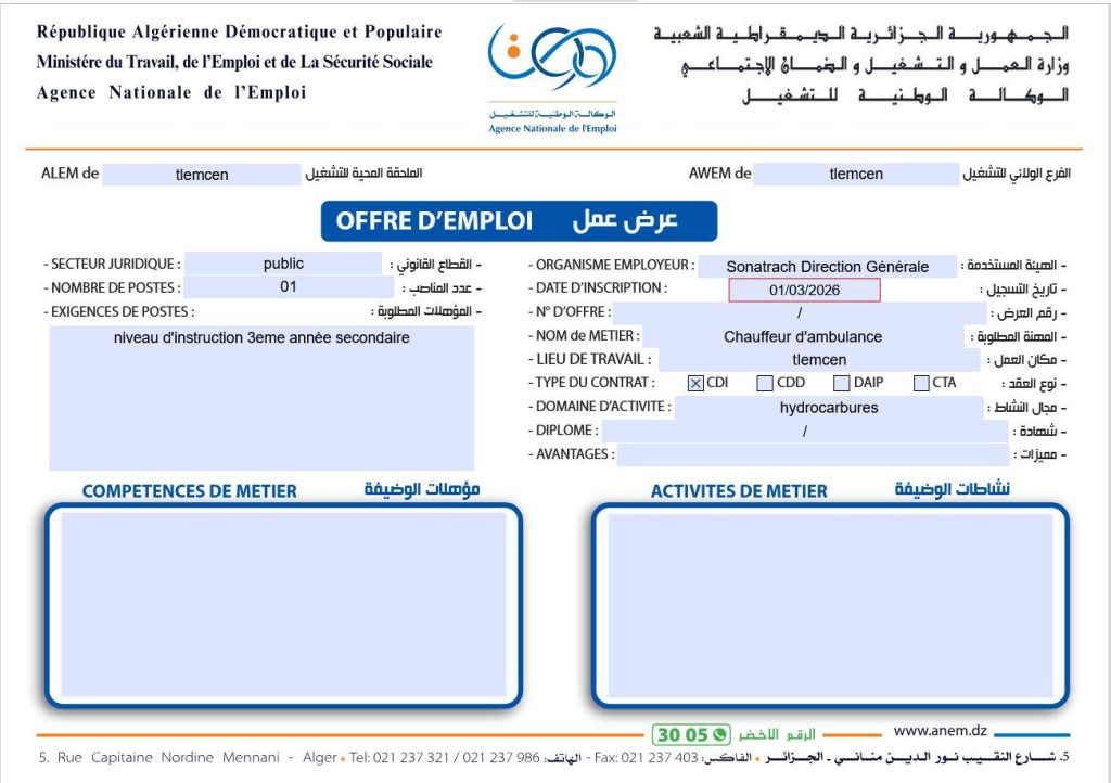 سائق سيارة إسعاف (Chauffeur d’ambulance)01مستوى تعليمي السنة الثالثة ثانوي