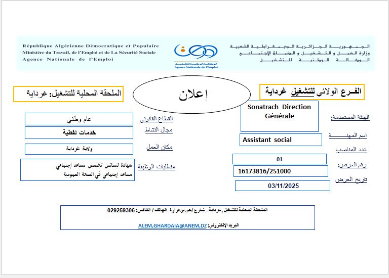 تعلن الملحقة المحلية للتشغيل غرداية عن توفر منصب شغل على مستوى Sonatrach Direction Générale المنصب كالتالي :