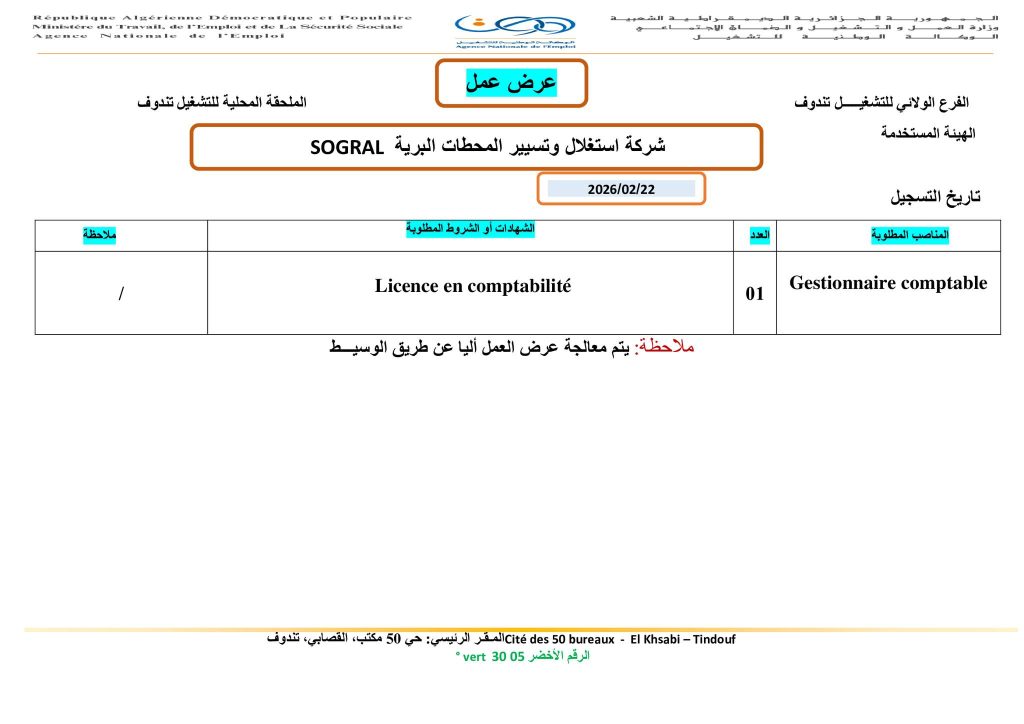 الهيئة المستخدمة: شركة استغلال وتسيير المحطات البرية SOGRAL
