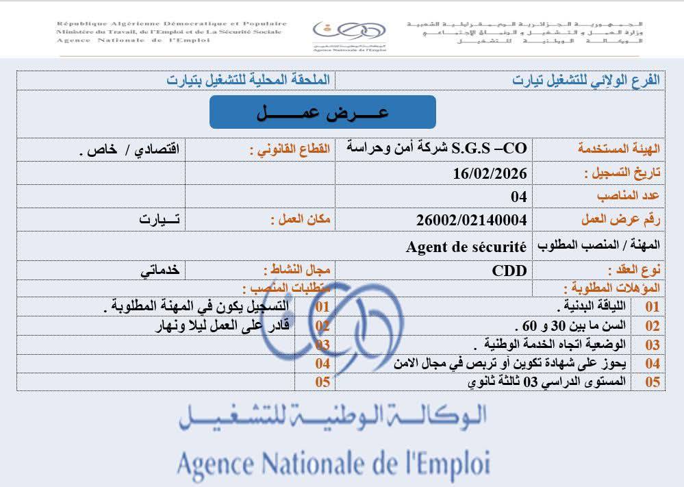 شركة الأمن والحراسة S.G.S – CO توظف أعوان أمن وحراسة أعوان نظافة ومنظفة