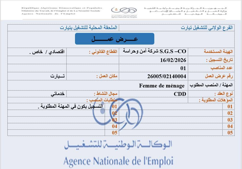 Femme de ménage (منظفة)0126005/02140004التسجيل يكون في المهنة المطلوبة.