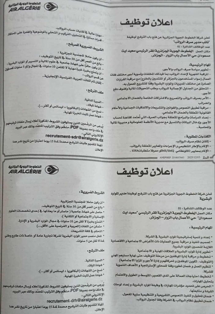 تُعلن شركة الخطوط الجوية الجزائرية عن فتح باب الترشح لوظيفة مدير الموارد البشرية (بمقر الشركة – الجزائر).