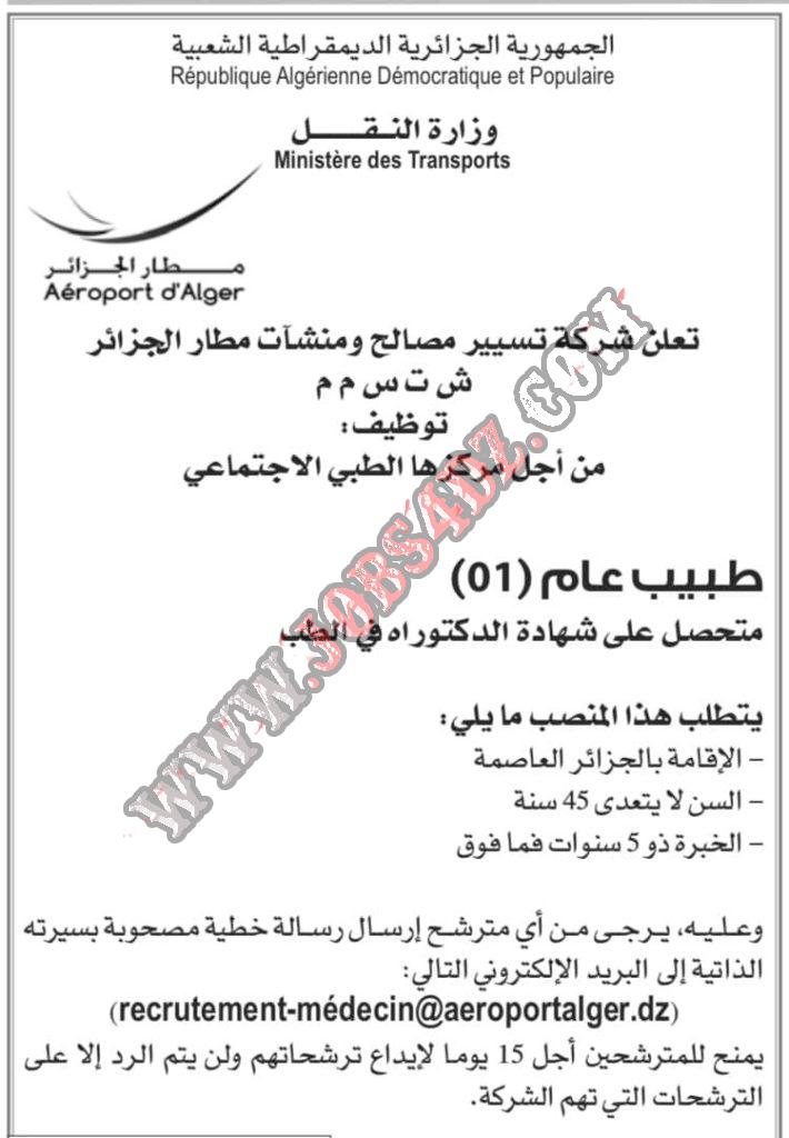 تعلن شركة تسيير مصالح ومنشات مطار الجزائر ش ت س م م توظيف من اجل مركزها الطبي الاجتماعي