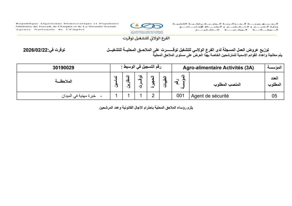 | Agro-alimentaire Activités (3A) | Agent de sécurité | 05 | الطيبات: / الحجيرة: 2 توقرت: 1 المقارين: 1 تماسين: 1 |