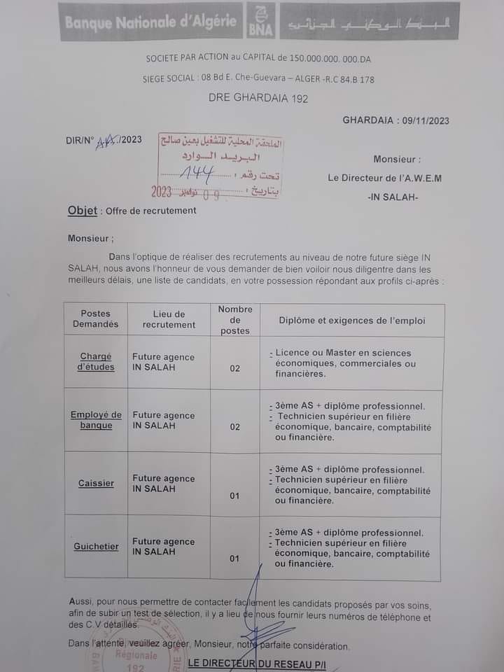 تعلن الملحقة المحلية للتشغيل عين صالح عن عرض عمل بالبنك الوطني الجزائري BNA كما هو موضح ادناه