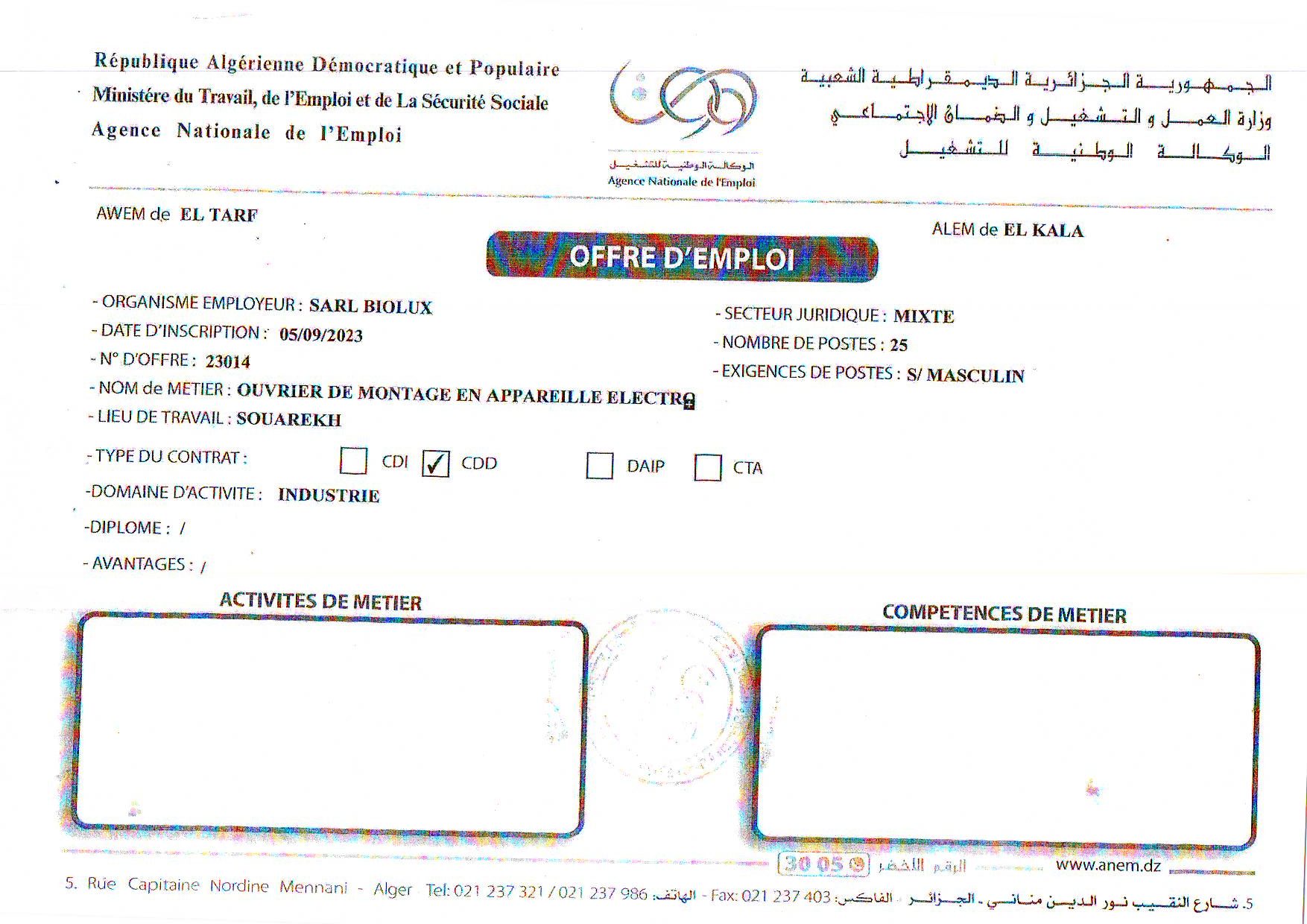 تعلن الملحقة المحلية للتشغيل القالة الطارف عرض عمل بالتعويض صالح على مستوى ولاية الطارف بشركة بيوليكس بالسوارخكما هو موضح ادناه